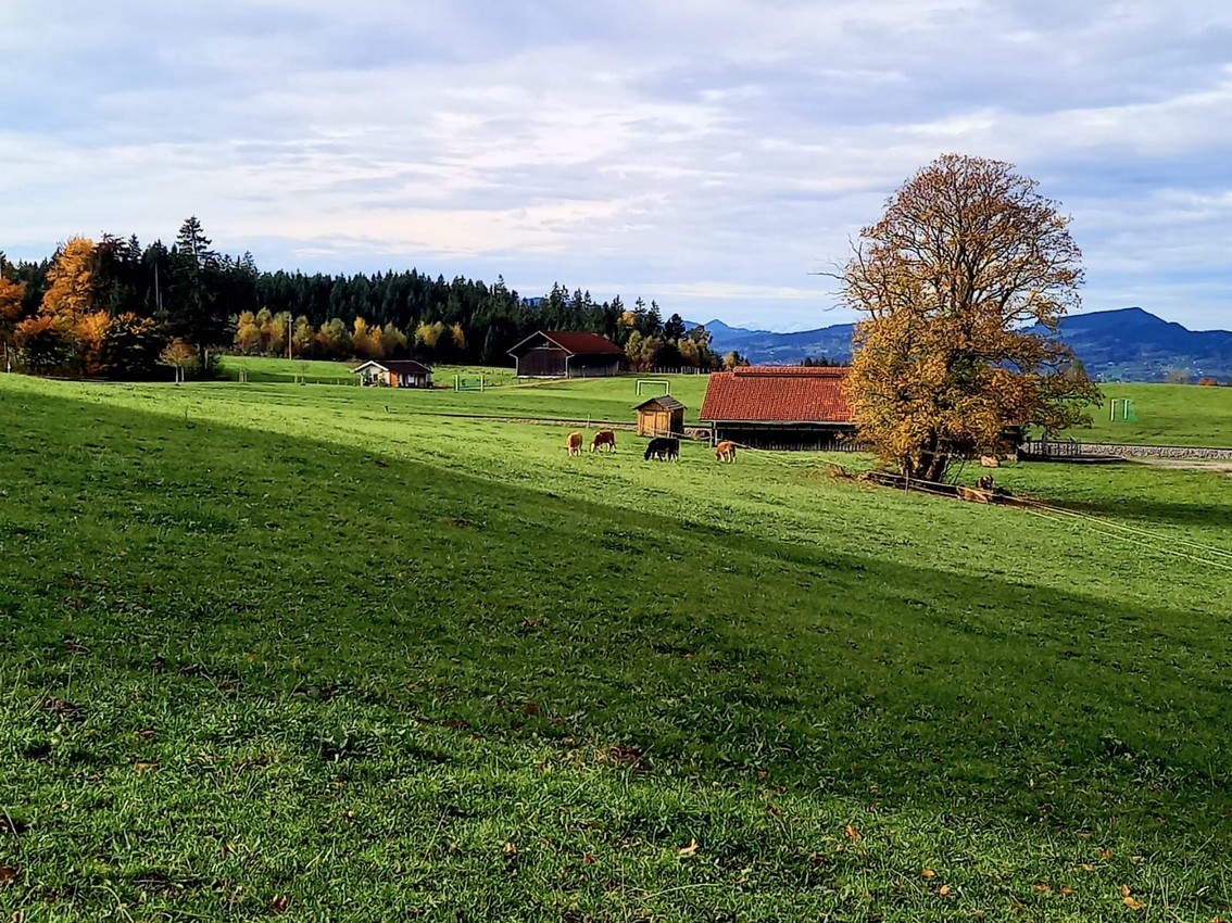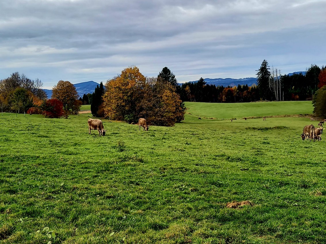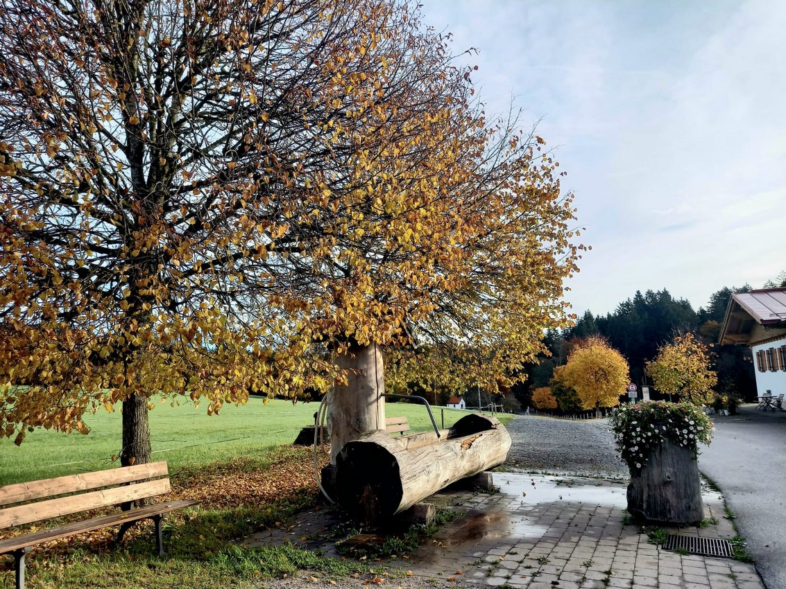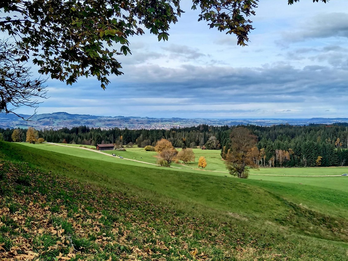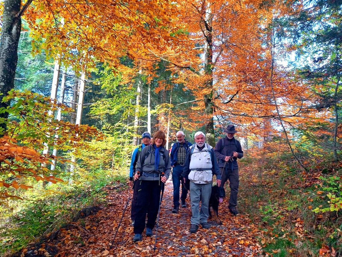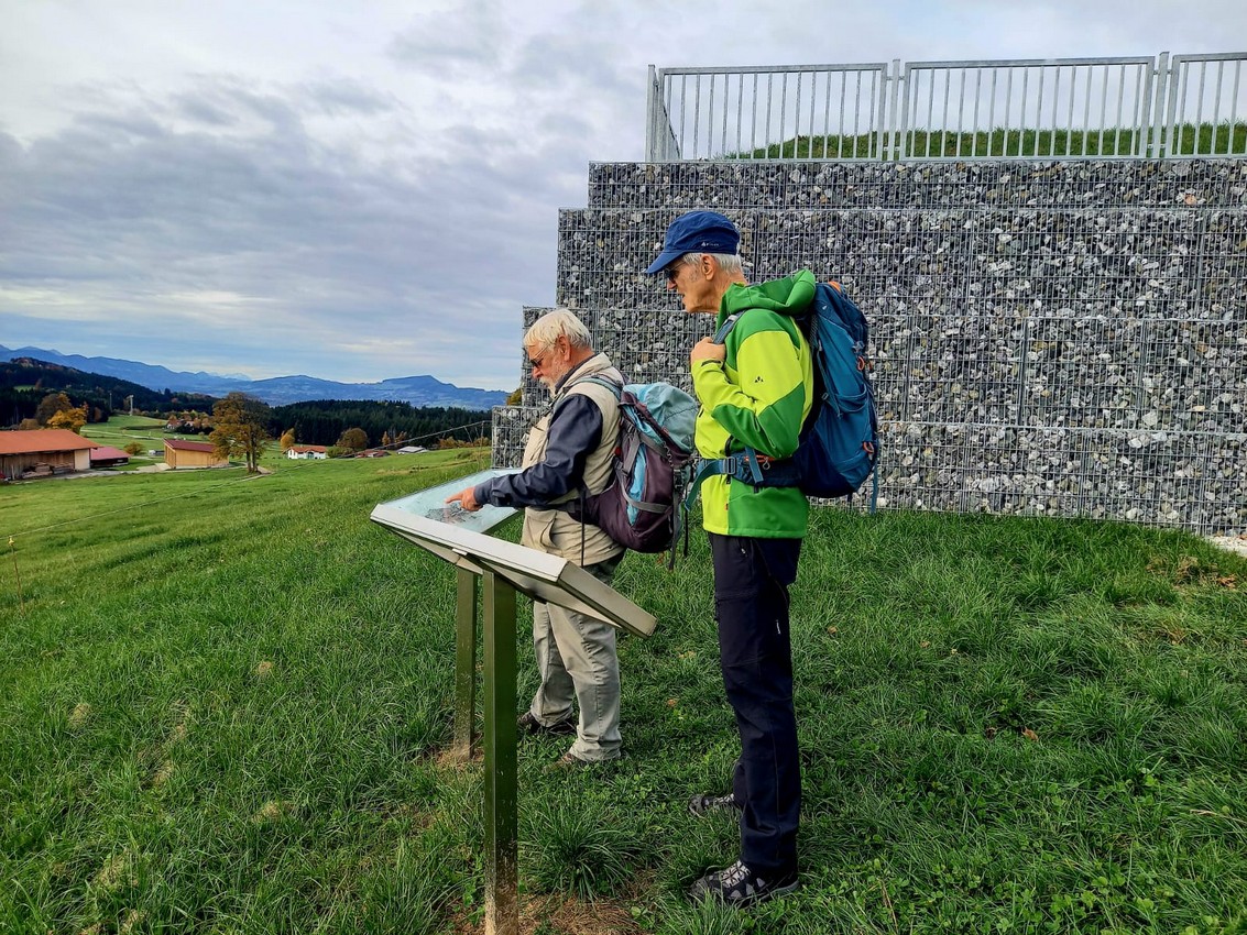 Durch herbstlich bunte Wälder, leider zu oft auf asphaltierten Wegen, wurde bald der Waldrand erreicht und der Bodelsberg von Osten her über Feldwege und Wiesengelände erstiegen. Vom seinem höchsten Punkt, 964 Meter hoch, lag die Alpenkette direkt vor uns. Zwischen der Benediktenwand im Osten und dem Säntis im Westen waren viele bekannte und unbekannte Gipfel zu erkennen. Beim Abstieg konnte dann an einer Panoramatafel jeder noch seine Gipfelkenntnisse bestätigen.