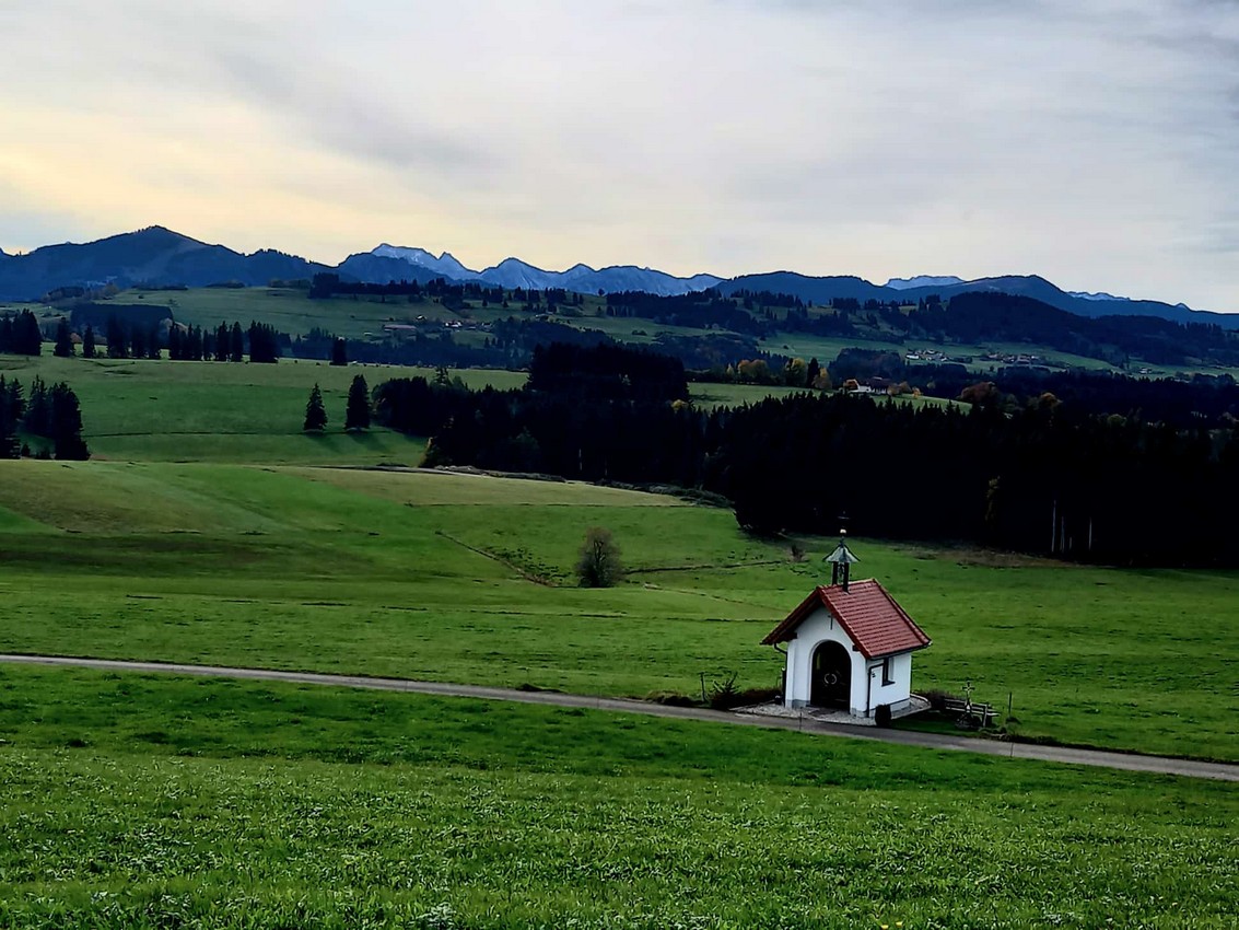 Das Wetter war an diesem Tag um Welten besser als angesagt. Schon bei der Anfahrt ins Allgäu zeigte sich die Alpenkette im Morgenlicht. Kurz nach Kempten war der Ausgangspunkt am Gasthaus Tobias südlich der Ortschaft Betzigau erreicht. Hier starteten die zwölf Teilnehmer zur Wanderung durch den Kempter Wald zur Ortschaft Bodelsberg.