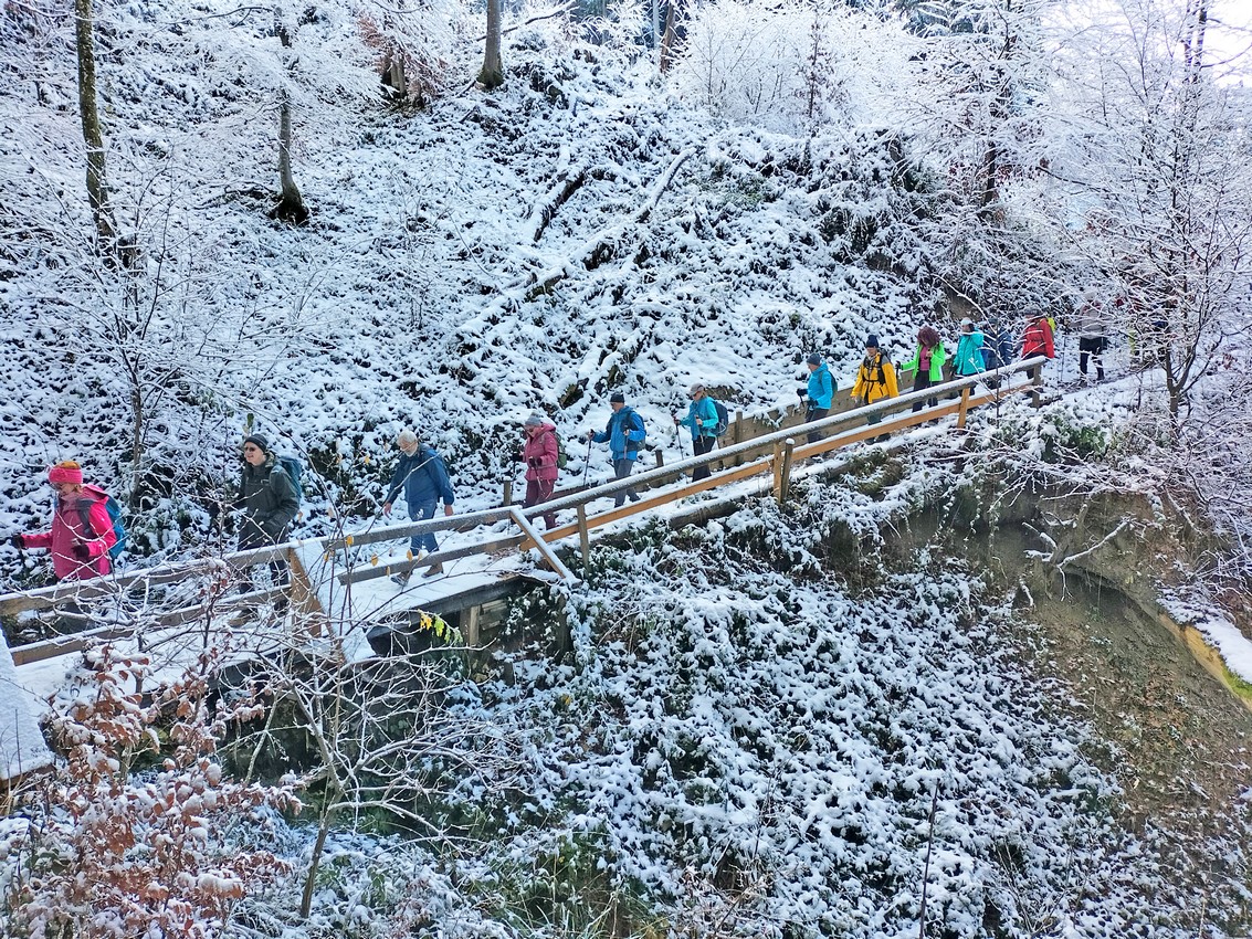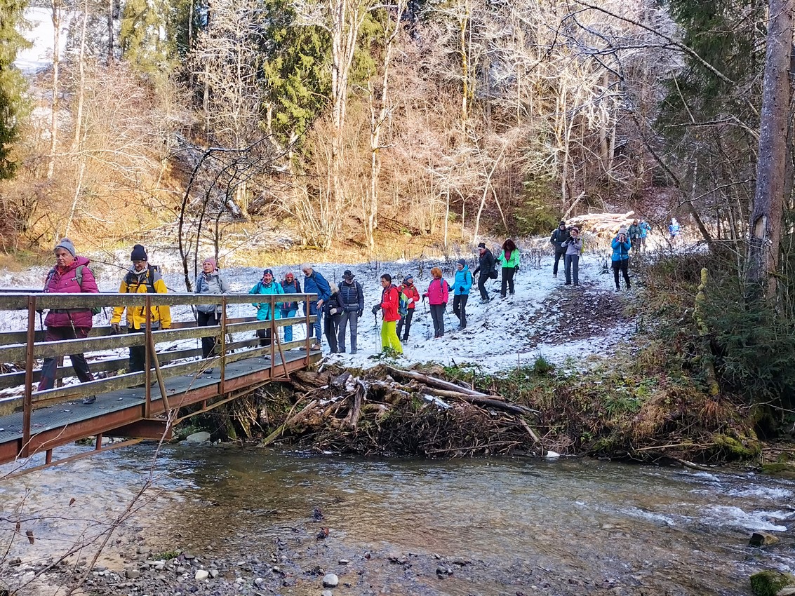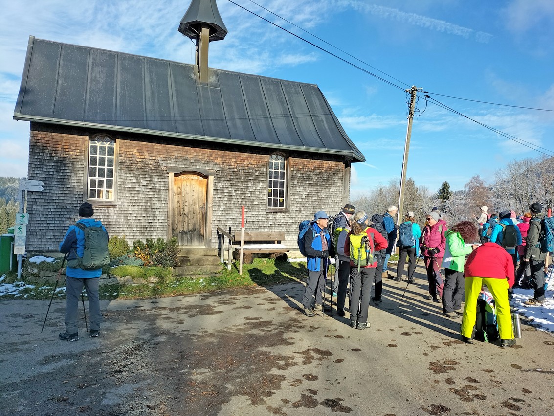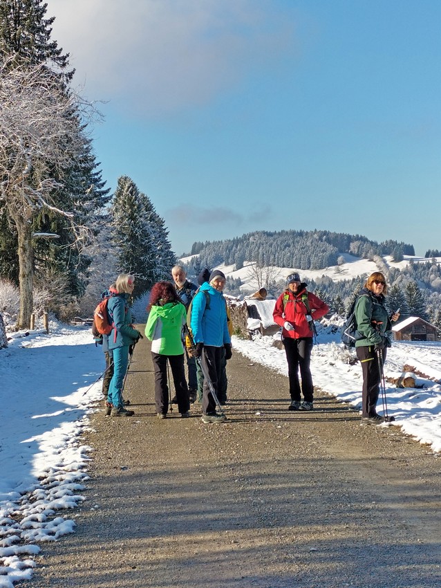 Über Nacht hatte der Winter den warmen Spätherbst abgelöst, und so machten sich die 23 Seniorinnen und Senioren bei Minusgraden auf den Weg nach Aigis im Allgäu. Hier wurden sie von einer dünnen Schneedecke und strahlendem Sonnenschein empfangen und konnten so eine Genusswanderung in einer wunderschönen Winterlandschaft genießen.