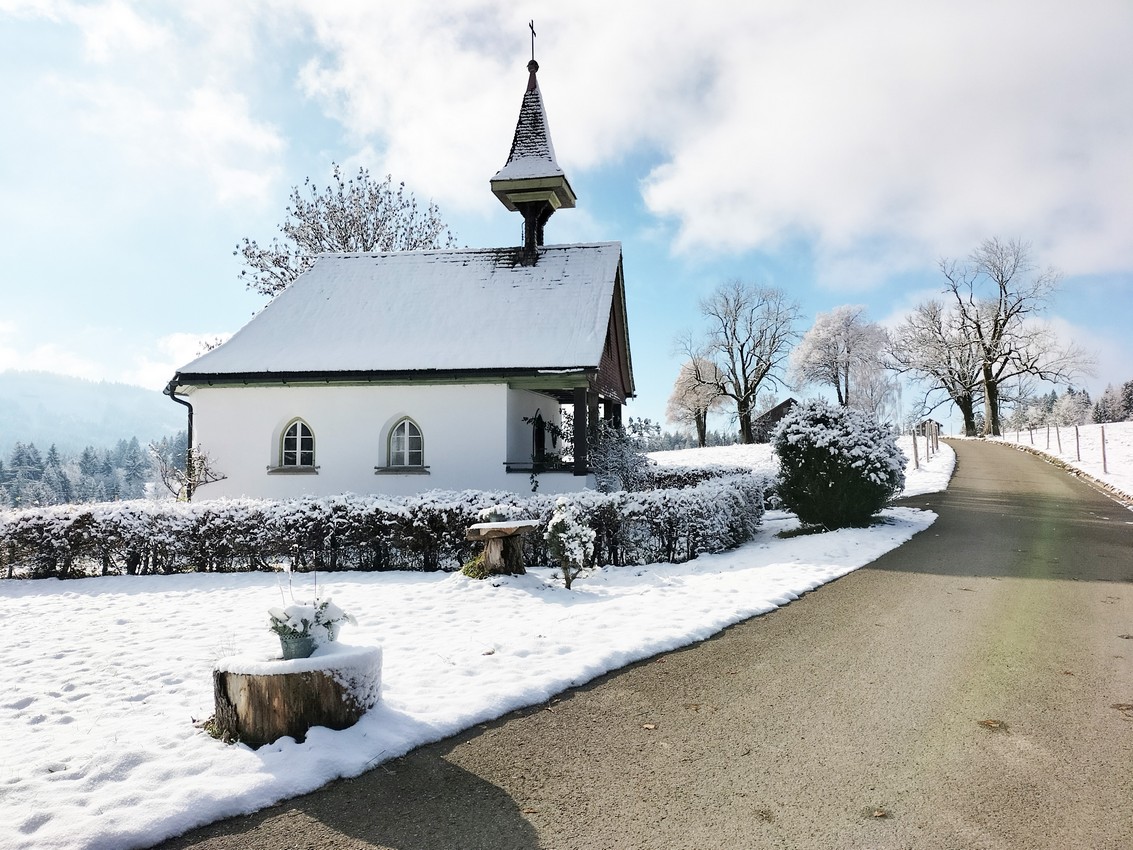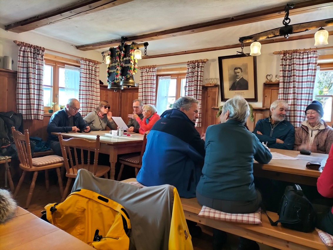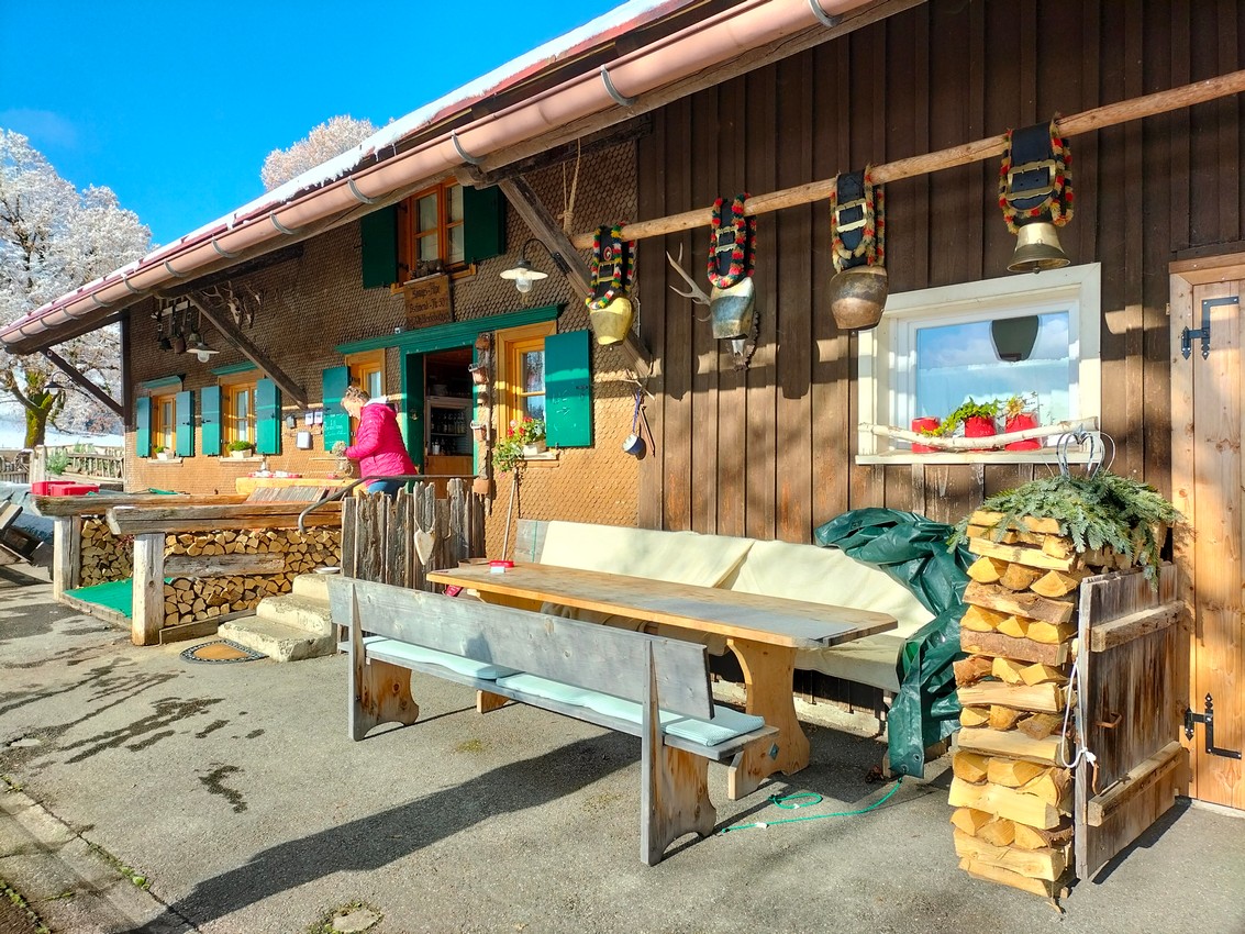 Zunächst auf breitem Weg, immer mit Blick auf den Ochsenberg und zur Thaler Höhe, wanderte die Gruppe zwischen schneebedeckten Wiesen und vereisten Bäumen zur Hirschgernalpe, die als Jagdhütte eines bekannten Fabrikanten aus Burladingen genutzt wird. Hier ging es steil hinab zur Brücke über den Jugetbach und danach ebenso steil aufwärts zur Bullenalpe. Von dort war es nicht mehr weit zur schön gelegenen Königsalpe mit der Bonaventurakapelle. Die herrliche Lage der Alpe und die freundliche Almwirtin veranlassten uns, schon hier in der Stube bei Kaffee, Kuchen, Suppe und Wienerle die Mittagspause einzulegen.