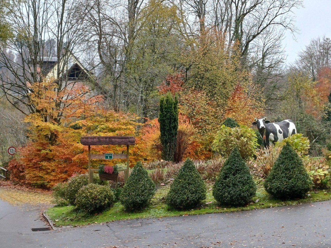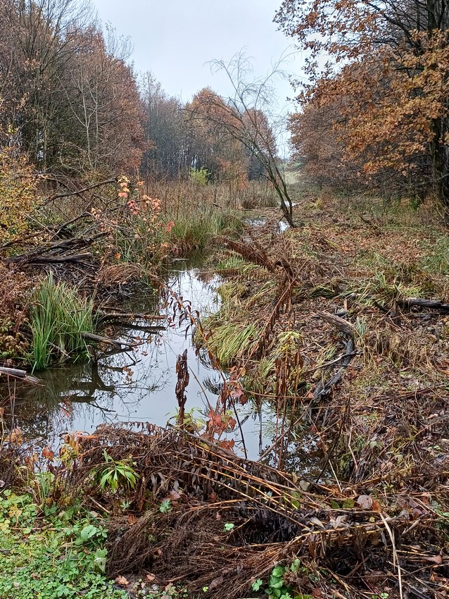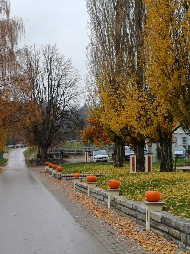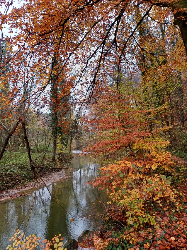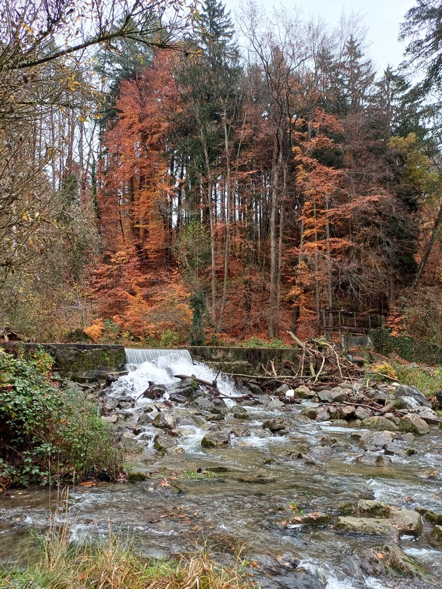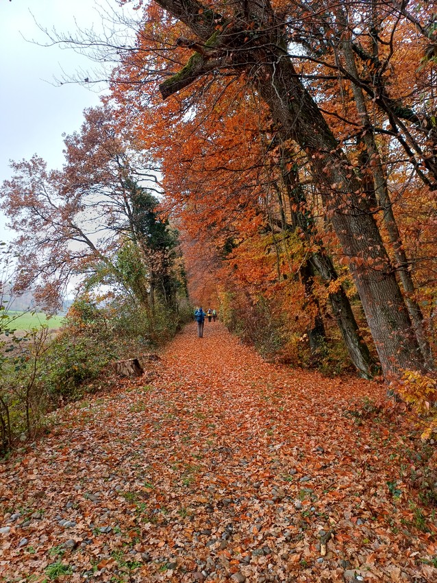 Zuerst ging es nach Süden über den Rohrbach, wo der Weg auf die ehemalige Bahntrasse traf. Ab hier führte der Weg vorbei am Ort Berg immer geradeaus Richtung Norden,  dann durch Obstplantagen und Riedwiesen aber auch auf schmalen Pfaden durch den Wald. Noch waren viele bunte Blätter auf den Bäumen, die selbst ohne Sonne ihre Farbe zeigten.
