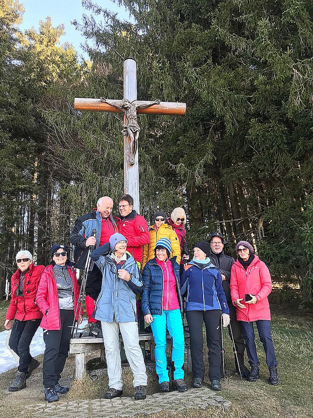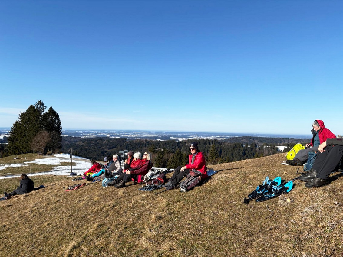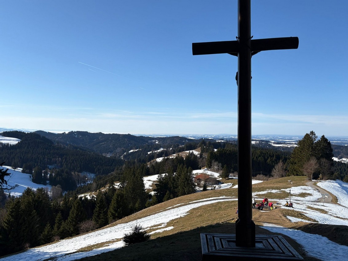 Um die Mittagszeit erreichte man die Kreuzleshöhe mit 1115 Metern Meereshöhe. Vom Schnee abgewehte Wiesenstücke luden zur Mittagsrast an der Sonne ein. Von hier bot sich ein herrlicher Blick ins schwäbische Oberland. Vom Gehrenberg über den Höchsten bis Schloß Zeil reichte der Blick. Ganz im Westen waren Altmann und Säntis zu erkennen. Nach der Rast zog es alle noch hinauf zu nahegelegen Gipfelkreuz der Kreuzleshöhe um ein paar Fotos zu machen.