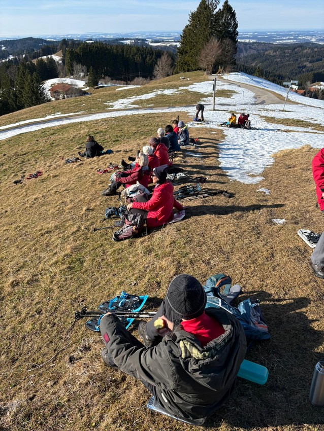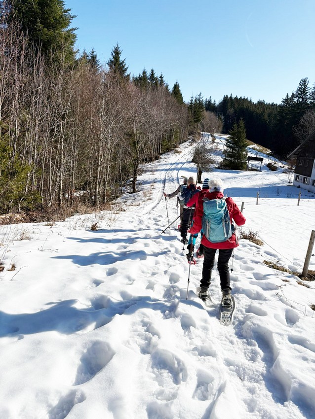 Im schattigen Tal folgte man auf eisigen Wegen dem Ulmer Tal, Vorsicht war angebracht. Bei der Abzweigung nach Wolfsberg konnten erstmals die Schneeschuhe benützt werden. Leider eine nur kurze Wegstrecke, denn der steile Waldweg hinauf zur Einöde Wolfsberg war total aper. Hier gab es die erste Rast in der Sonne auf der Veranda des Anwesens.