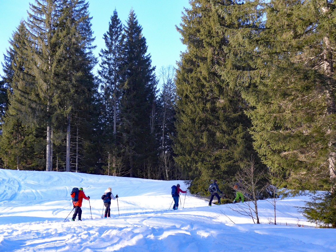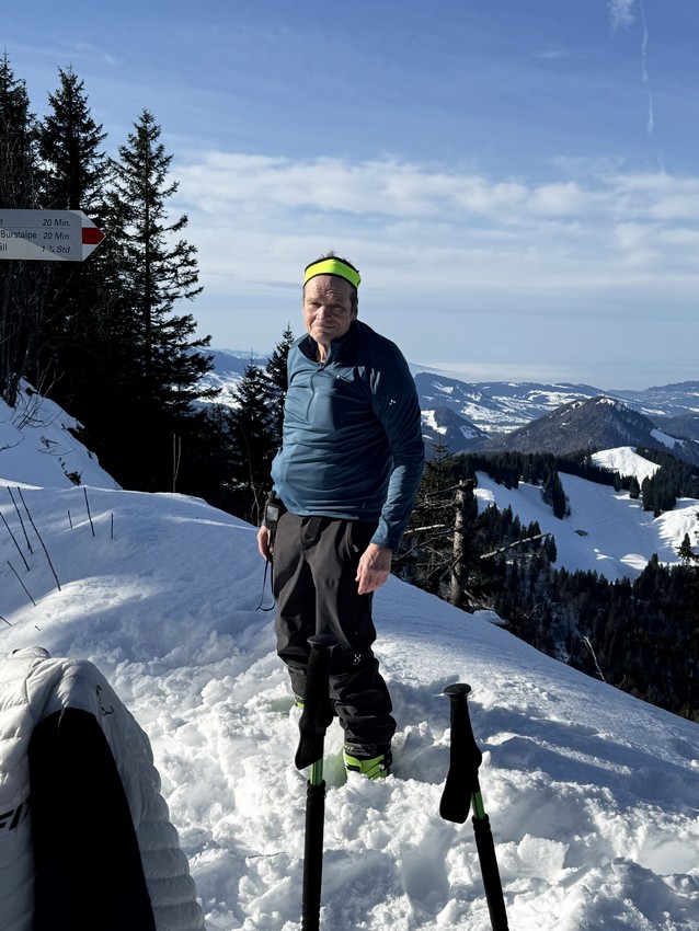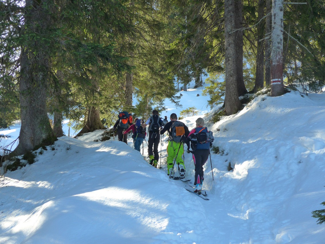 Vom Parkplatz des Skigebiet Balderschwang folgen wir (6 Skitourenbegeisterte unter Führung von Hartmut Presting) der Bolgenach, bis zu einer Brücke wo wir den Bach überqueren. Von dort führt uns die Tour entlang der Loipe nach Süden bis zur Skitouren-Infotafel des DAV. Wir wählen an einer Gabelung den rechten Fahrweg (Ww. Burglhütte), überqueren den Lappach und gelangen leicht ansteigend zu den freien Wiesen der Lappachalpe. Diese queren wir gerade nach Süden und folgen im Wald weiter dem Fahrweg zur Stadelmannburstalpe. Dort angekommen „skiwandern“ wir auf dem Almweg weiter nach Süden in Richtung Burglhütte, vor der sich der Wald lichtet und sich ein freier Talkessel öffnet. Kurz nach der Burglhütte gehen wir zunächst noch ein Stück flach abwärts nach Süden und halten uns dann rechts, wobei man eine Alphütte anpeilt. Über einen breiten, aber etwas steileren Hang gehen wir schließlich zum Gipfelkamm hinauf, über den man nach rechts zum Gipfelkreuz gelangt. Dort angekommen machen wir bei strahlendem Sonnenschein eine ausgedehnte Gipfelrast.