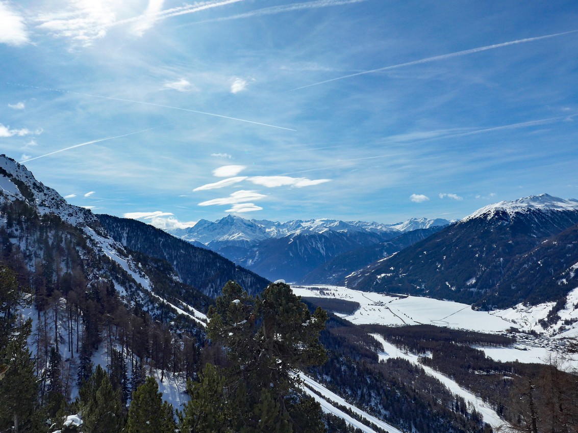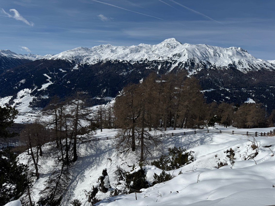 Der Sonntag machte seinem Namen alle Ehre: blauer Himmel zeigte sich am Horizont. Geduld zahlt sich eben aus. Nach einer herzlichen Verabschiedung von Karl fuhren wir zurück Richtung Reschensee. Diesmal erkundeten wir die Ostseite bis zur Grauner Alm. Die umliegenden Gipfel –mit Blick bis zum Ortler –präsentierten sich in voller Pracht, auch wenn wir sie diesmal nur aus der Ferne bestaunen durften. Doch das tat der Stimmung keinen Abbruch: Pulverschnee bei Sonnenschein –eine lohnende Abschlusstour.