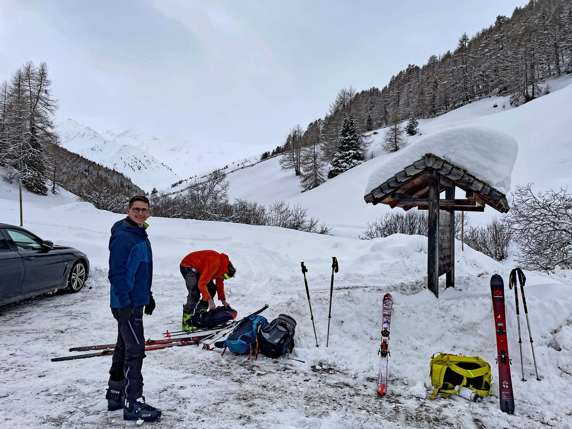 Früh am Morgen ging es los. Ich stieg um 6:30 Uhr in Berkheim zu, und gemeinsam machten wir uns auf den Weg Richtung Vinschgau. Geplant war eine Eingehtour im Rojental am Reschenpass. Unterwegs zeigte sich: Von Schneemangel konnte mittlerweile keine Rede mehr sein. Seit Tagen hatte es geschneit, und wir fuhren durch eine tief verschneite Winterlandschaft über das Allgäu und den Fernpass. So schön der viele Neuschnee war – er brachte auch Herausforderungen mit sich. Die Lawinenwarnstufe war auf 4 angestiegen. Diese Situation war uns bereits vor der Abfahrt bewusst, und entsprechend defensiv gestalteten wir unsere Tourenplanung.