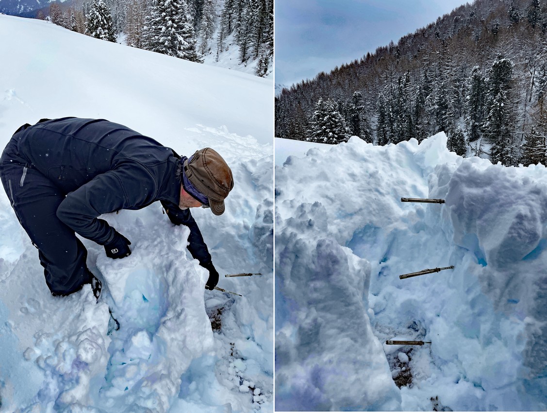 Im Rojental ging es dann in Richtung Innerer Nockenkopf. Wir blieben jedoch konsequent unterhalb der Baumgrenze und mieden steilere Hänge. Ein Gipfel war unter diesen Bedingungen keine Option. Stattdessen nutzten wir die Gelegenheit sinnvoll: Wir legten ein Schneeprofil an, bei dem Thomas sein Equipment –inklusive Schneethermometer –testen konnte.