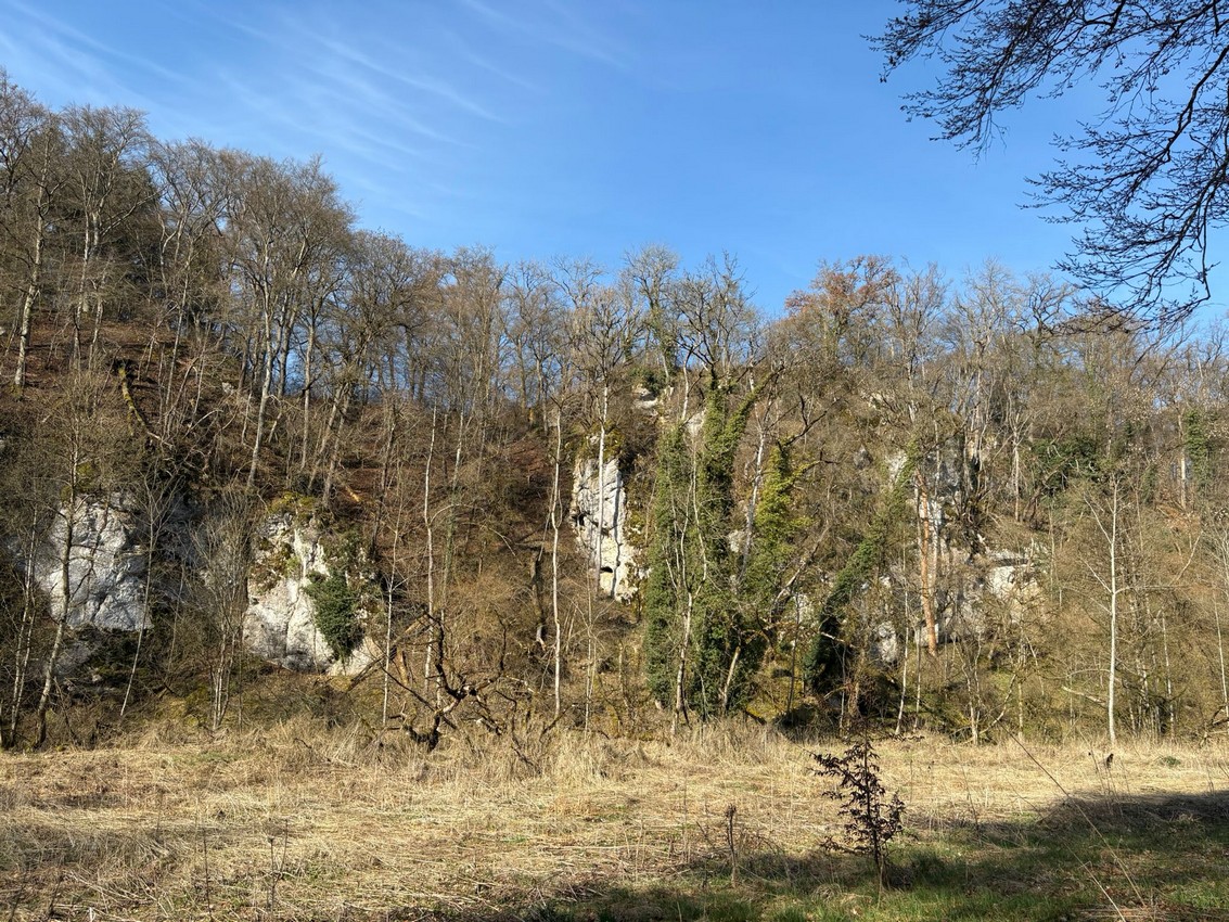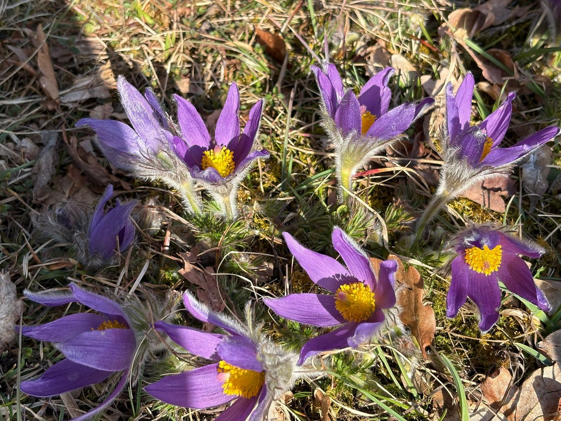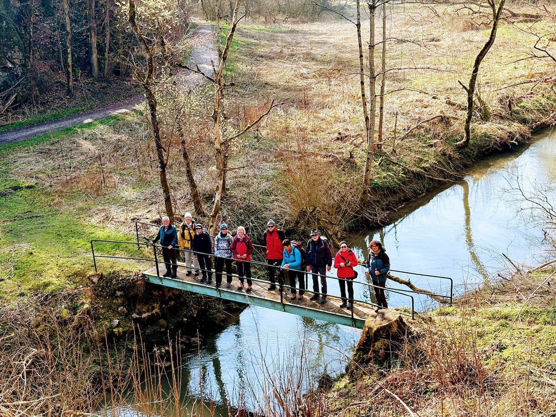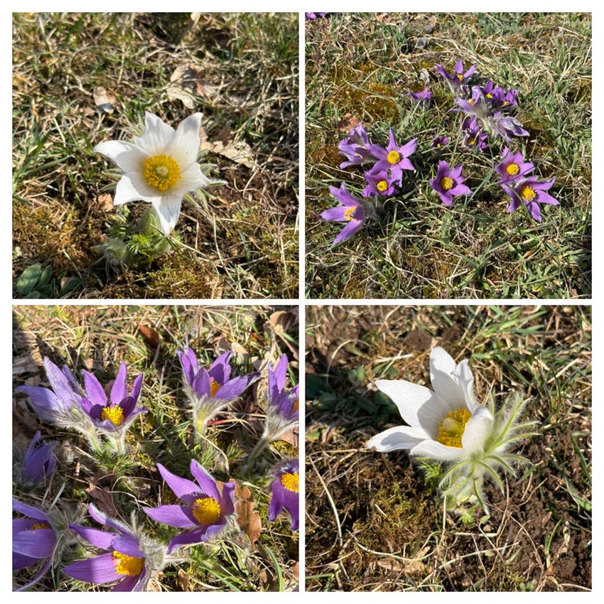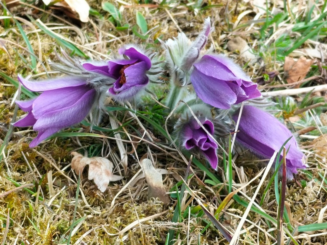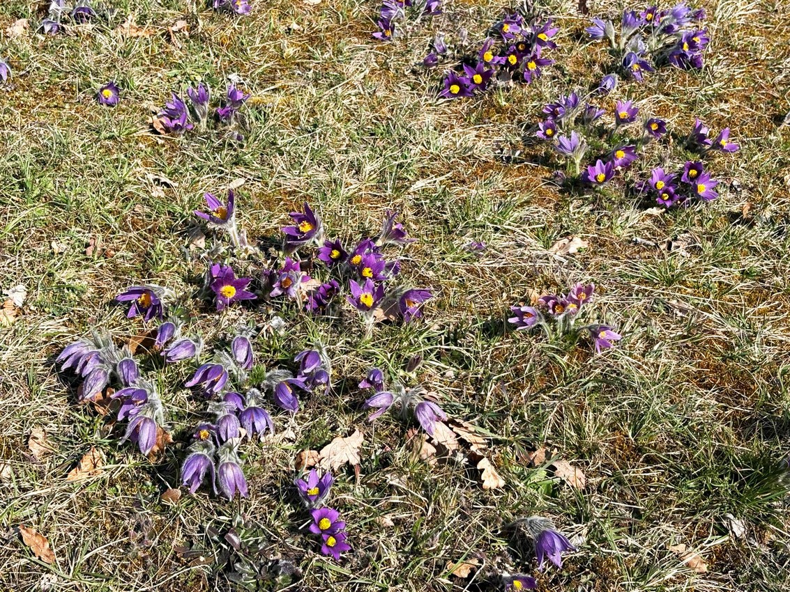 Durch schütteren, noch laublosen Auwald wanderte die Gruppe ca. 1 km flussaufwärts der Donau entlang bis zu einer Abzweigung. Hier führte ein kleiner Tunnel unter der Bahntrasse hindurch zu den bewaldeten Hängen unterhalb von Talheim. Entlang eines wunderschönen Quellbaches führte der Weg hinauf durch den Wald bis zu den Magerwiesen mit dem Vorkommen von hunderten von Küchenschellen, die sich hier in ihrer schönsten Pracht zeigten. Hier wurde eine erste Pause wurde eingelegt um diesen Ort zu genießen.