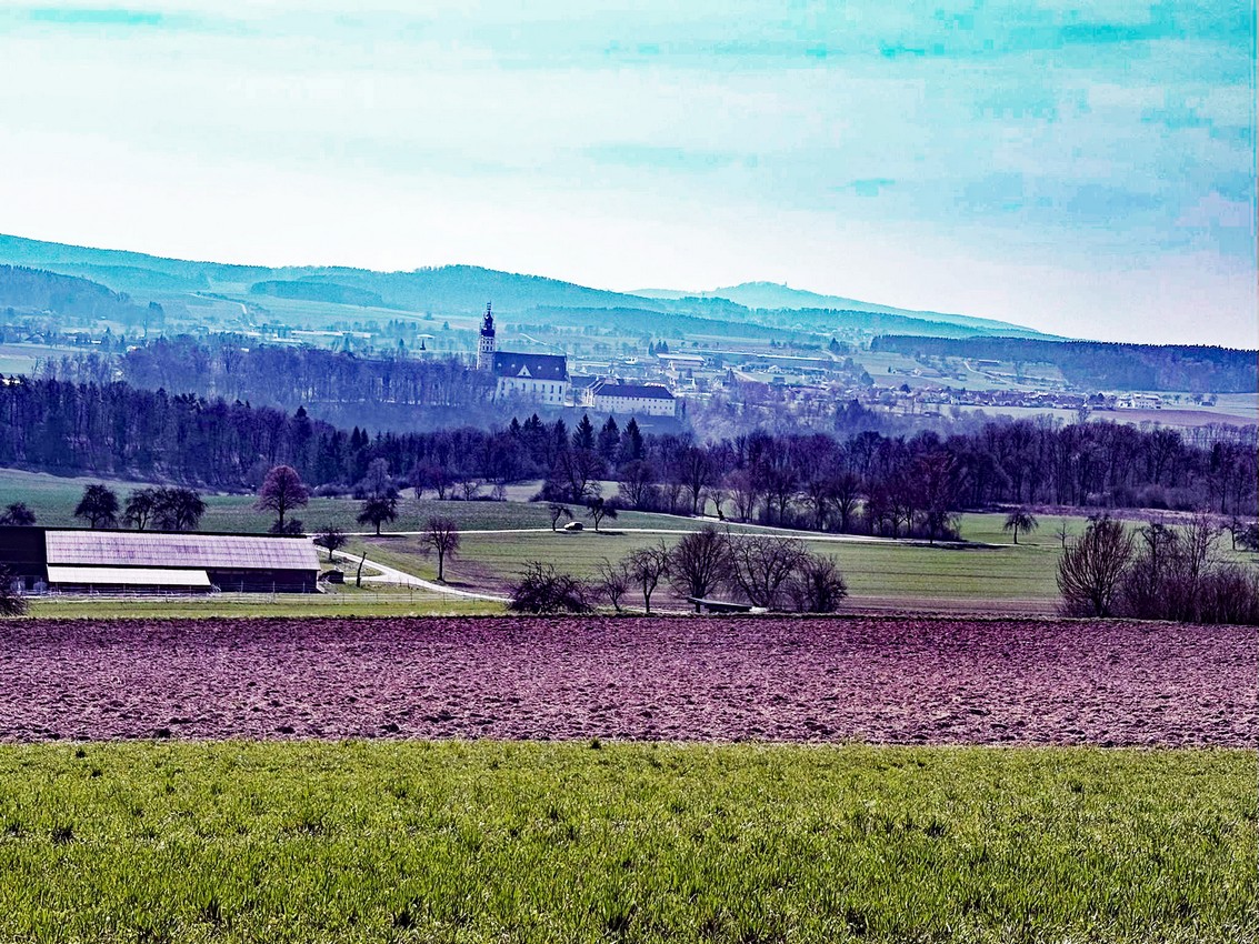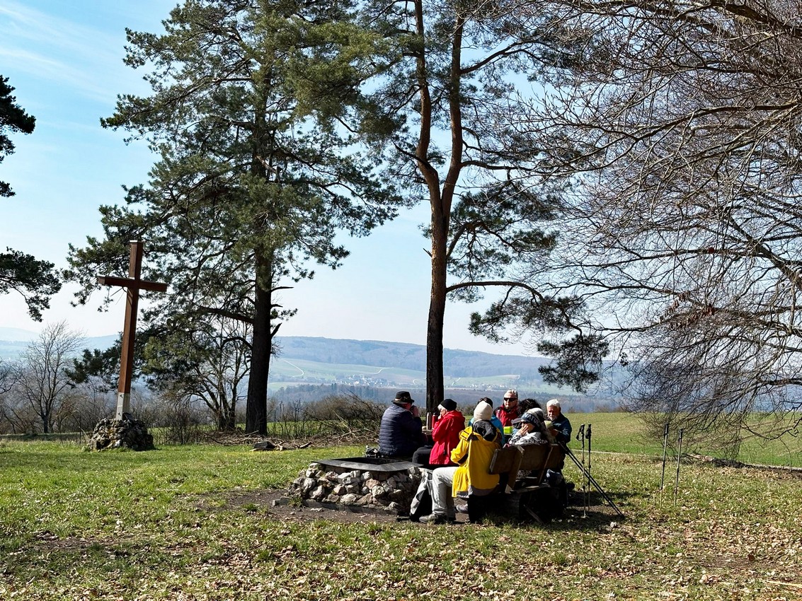 Der Weiterweg führte dann durch die Ortschaft Talheim hinauf zum Hochberg, dem höchsten Punkt in der Umgebung mit einer Höhe von 671 Metern. Bänke und eine herrliche Aussicht luden hier zu einer längeren Rast ein. Die Alpen waren wegen der Schönwetterlage allerdings nicht zu erkennen.