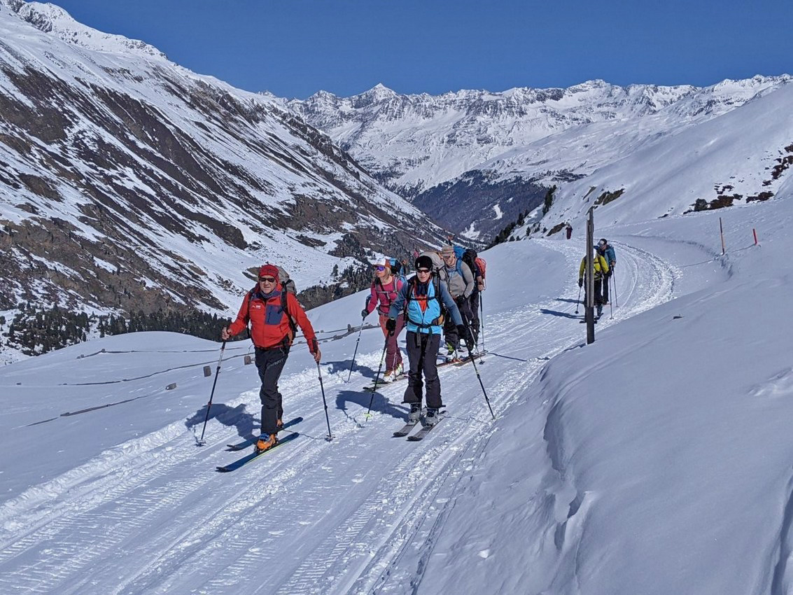 Vom Gipfel gelangen wir zu Fuß zurück zum Skidepot. Von dort fahren wir entlang der Aufstiegsroute bei wechselhaften Schneebedingungen zur Langtalereckhütte ab. Dort angelangt gönnen wir uns noch eine kleine Stärkung und machen uns anschließend auf die Abfahrt zur Talstation in Obergurgl, wo sich auch schon der Wetterumschwung mit Schneefall ankündigt.