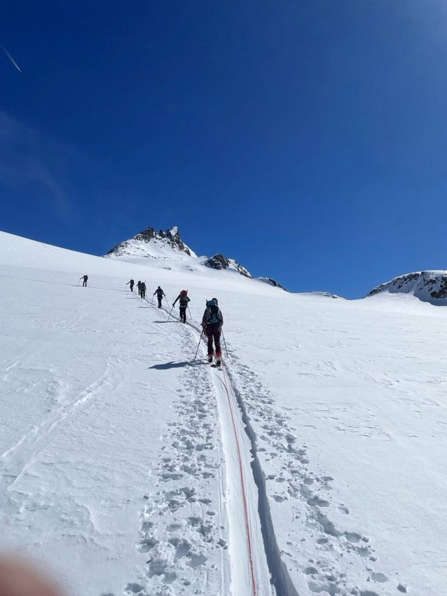 Unmittelbar an der Hütte schwenken wir über einen breiten, gestuften Rücken nach links ab und nach etwa 300 Hm öffnet sich vor uns das Innere Hochebenkar. Durch dieses bewegen wir uns größtenteils recht flach noch einmal 400 Hm hinauf bis unter die Scharte links von unserem Gipfel. Hier hatten wir ausreichend Möglichkeiten Spitzkehren im Steilgelände zu üben. In der Scharte (3133m) angekommen lassen wir die Ski stehen und gehen die letzten 100 Hm zuerst auf einem breiten Rücken, zuletzt auf einem nicht allzu schmalen Grat auf den Gipfel des Eiskögele.