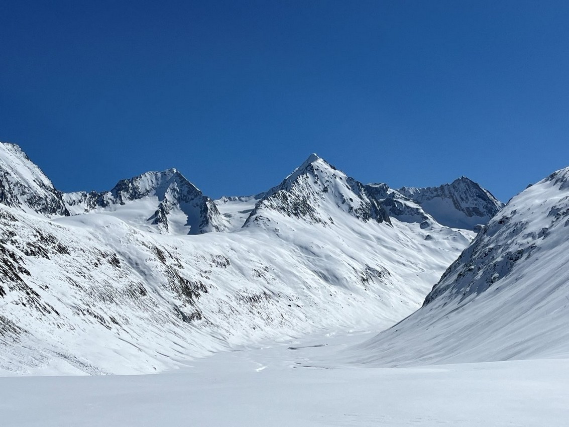 Für die Abfahrt entscheiden wir uns für die landschaftlich sehr lohnende Überschreitung. Vom Sattel fahren wir nordostwärts durch eine sehr steile, breite Rinne auf den Langtaler Ferner ab. Hier treffen wir auf unverspurte Tiefschneehänge. Unter den Felsen des Annakogels umgehen wir die Gletscherbrüche westlich, anschließend erfolgt die Abfahrt über weites, offenes Skigelände hinab ins breite Langtal und flach talauswärts, bis zu einer kleinen Eisenbrücke. Von dort gelangen wir mit kurzem Gegenanstieg zurück zur Hütte. Nach der Rückkehr an der Hütte lassen wir den ereignisreichen Tag mit überwältigenden Eindrücken bei tollen Gesprächen und einem leckeren Abendessen ausklingen.