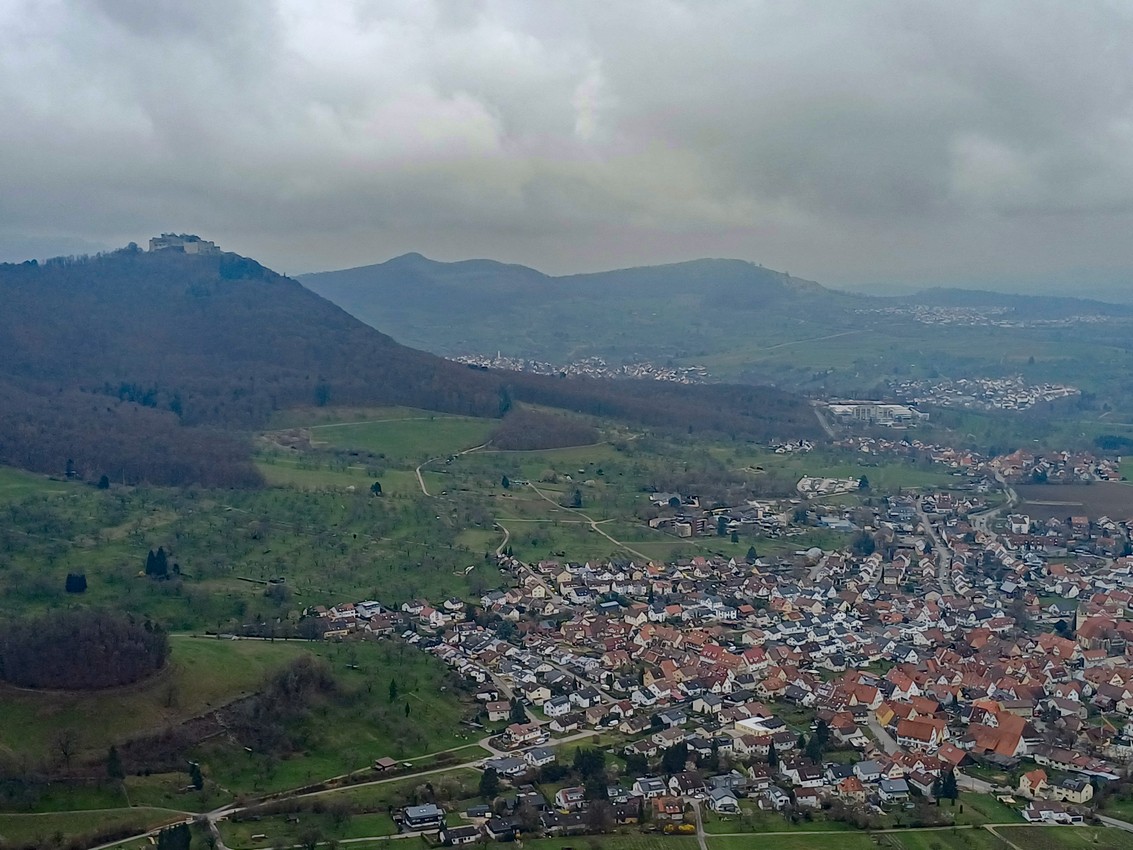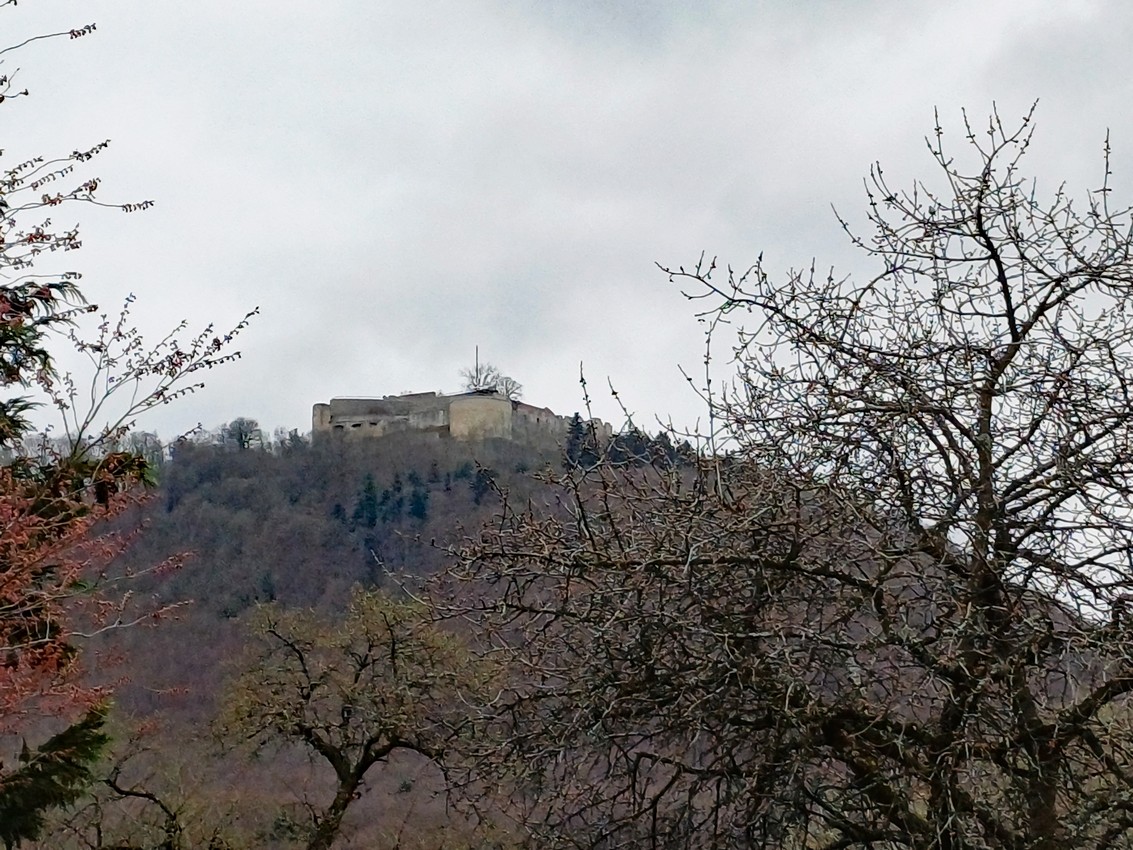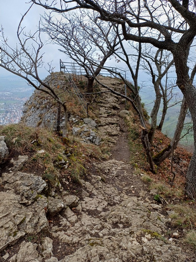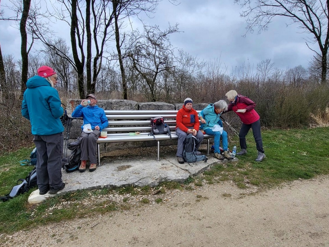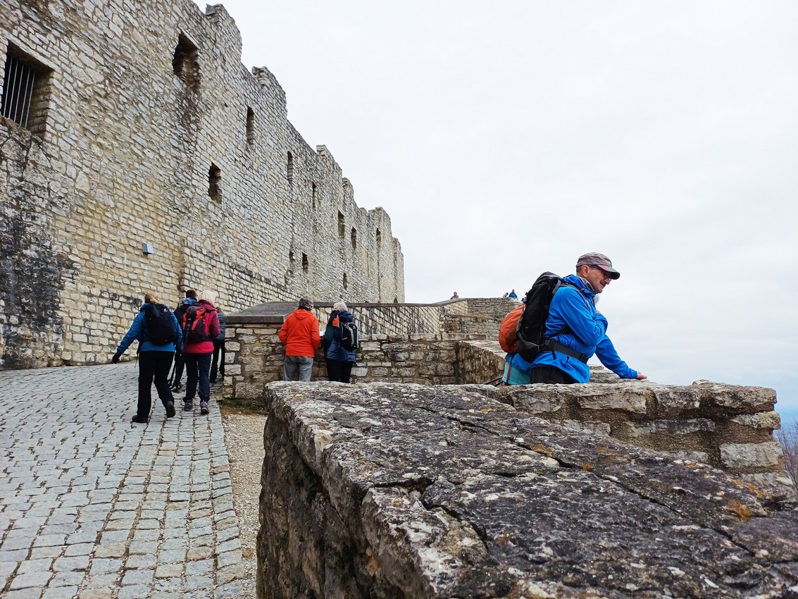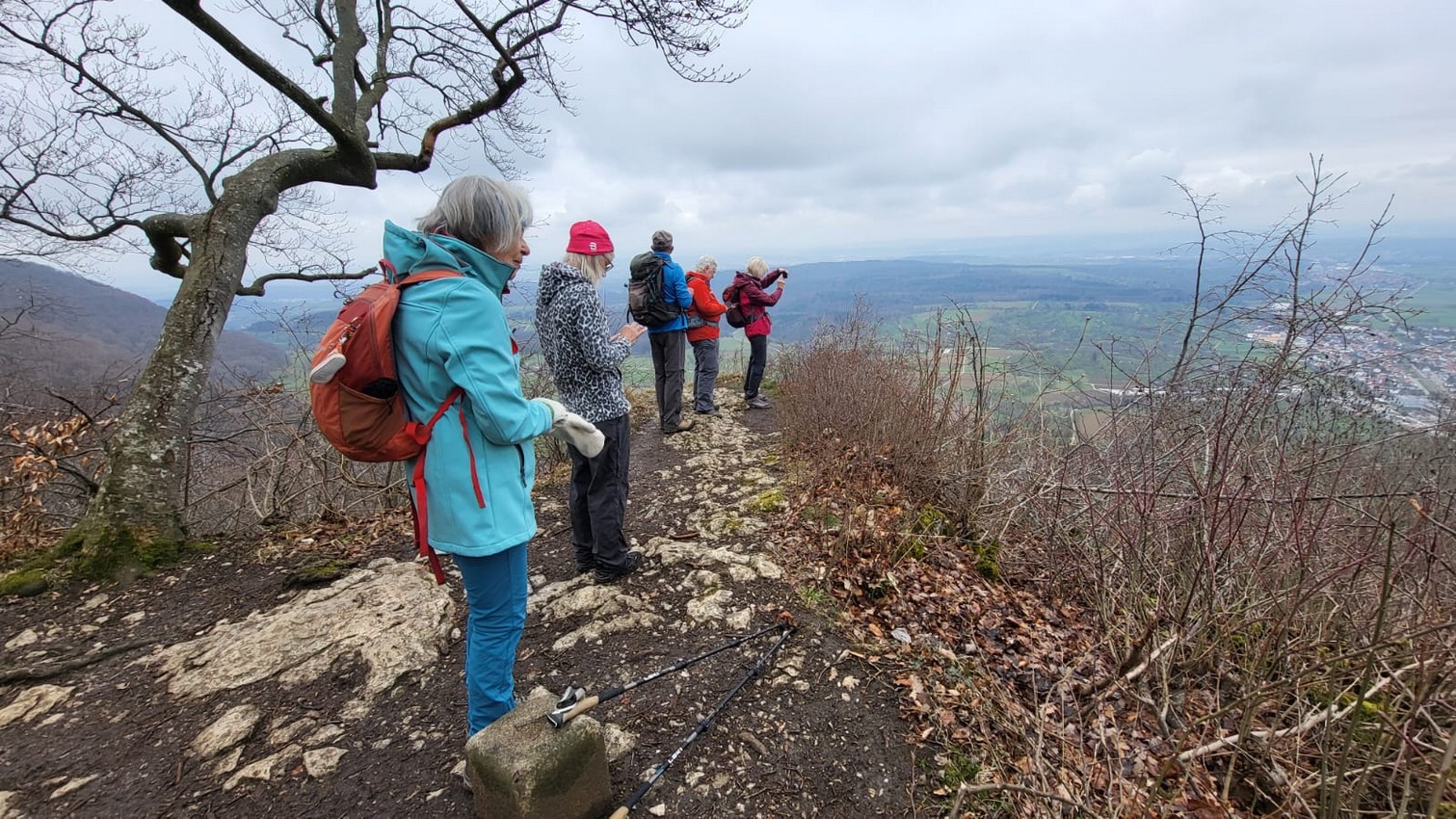 Zunächst ging es durch den Ort Beuren hoch zum Beurener Fels, der einen ersten Ausblick in den Stuttgarter Raum bot. Die nächste Station war der Brucker Fels mit Blick ins Lenninger Tal. Über den Heidengraben führte anschließend der Weg nach Erkenbrechtsweiler, wo eine Bank zur Mittagspause einlud. Allerdings war die Rast nur kurz, denn ohne Sonnenschein war es doch etwas zu kalt zum längeren Verweilen.
