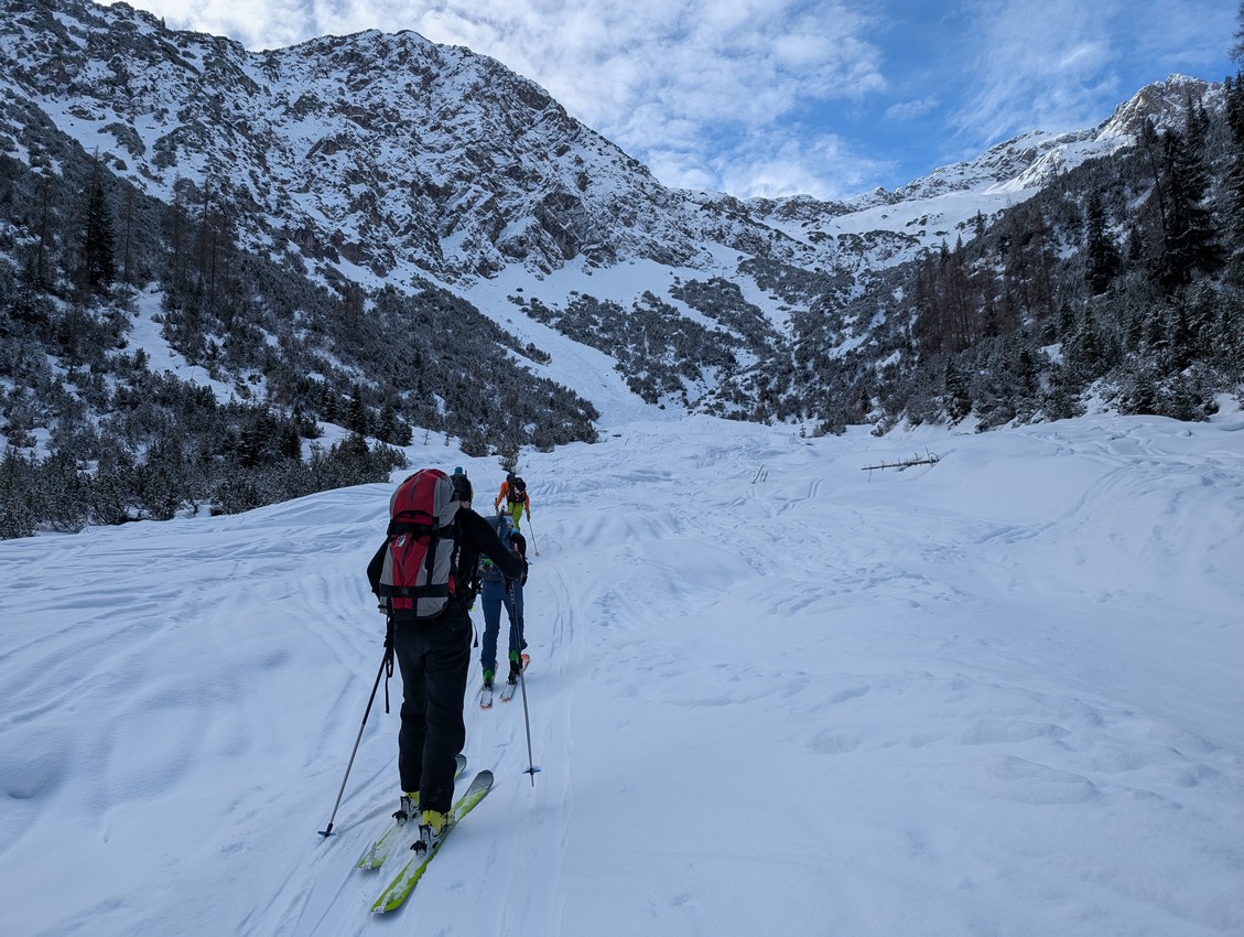 Los geht es nach einem schnellen LVS-Check von Gramais aus ein kleines Stück zu Fuß und dann auf den Ski weiter entlang eines Forstwegs bergan. Nach Überquerung des Roßkarbachs betreten wir weitläufigeres Gelände und die immer besser werdende Sicht und Schneeverhältnisse lassen uns ahnen, dass der Tag vielleicht doch noch so manche Überraschungen für uns bereithalten könnte.