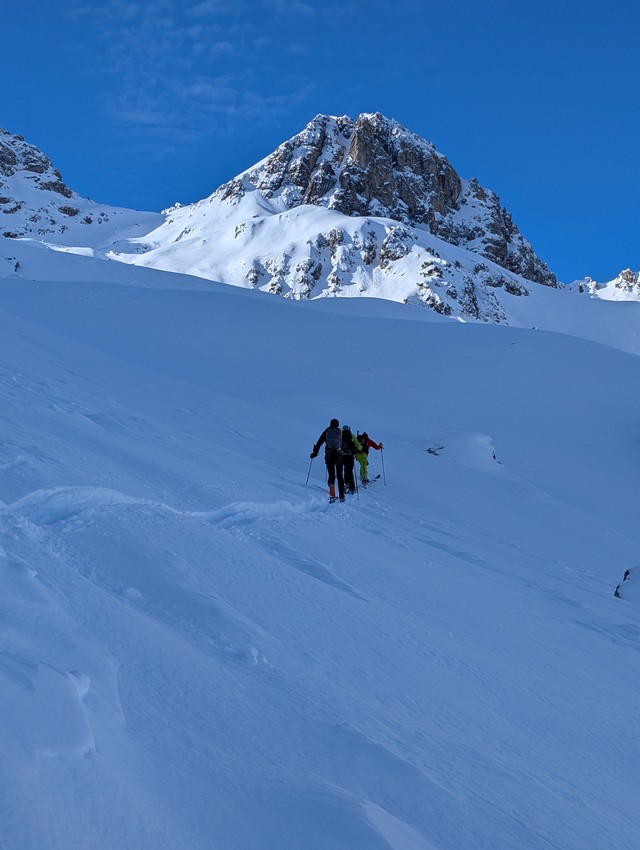 Auch zum Üben unserer Spitzkehren haben wir im weiteren Verlauf der Tour reichlich Gelegenheiten, denn es wird zunehmend steiler, aber je höher wir kommen, desto besser wird von Höhenmeter zu Höhenmeter auch der Schnee.